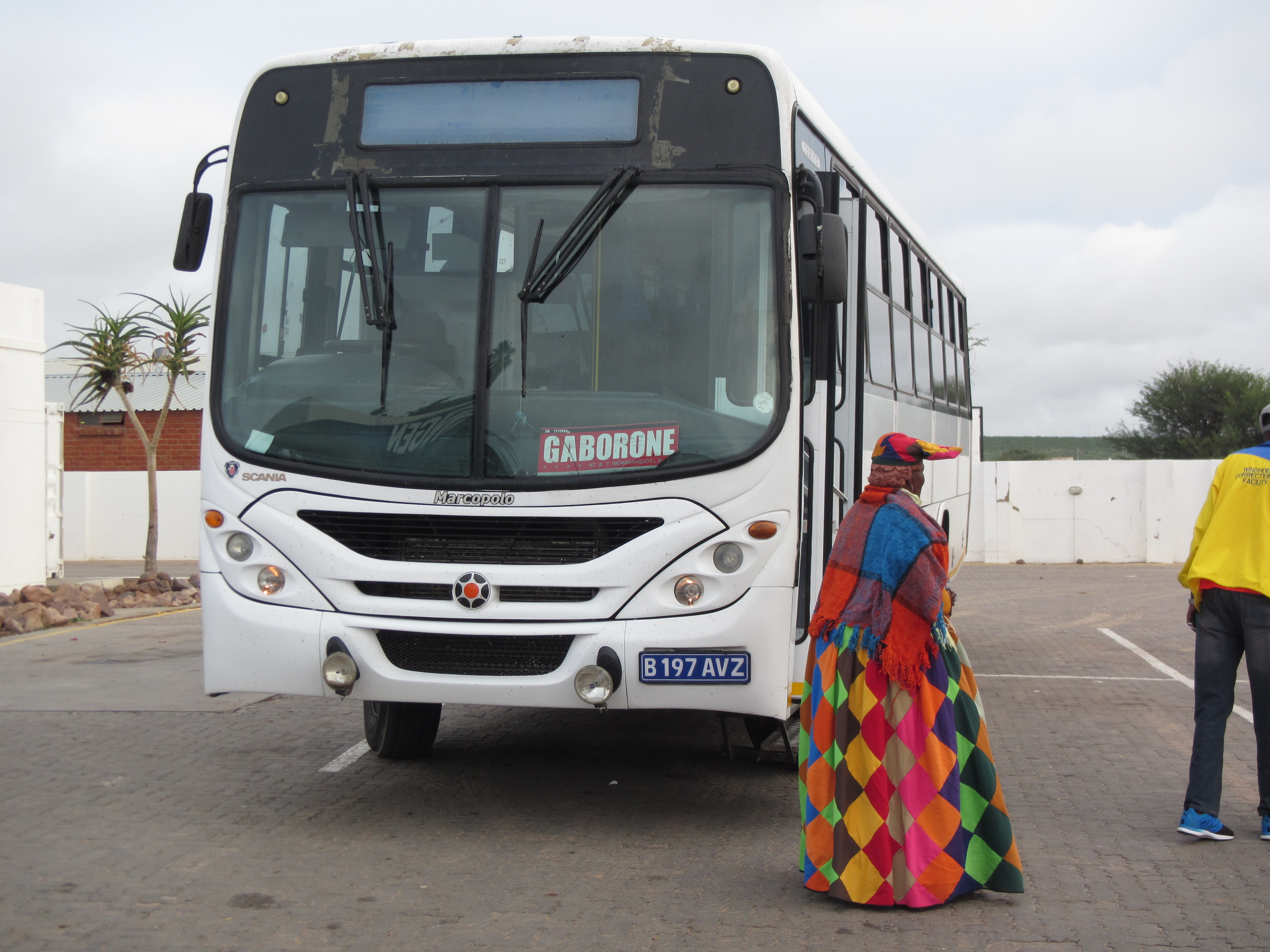Eine Hererofrau vor dem Bus nach Bostwana in Namibia